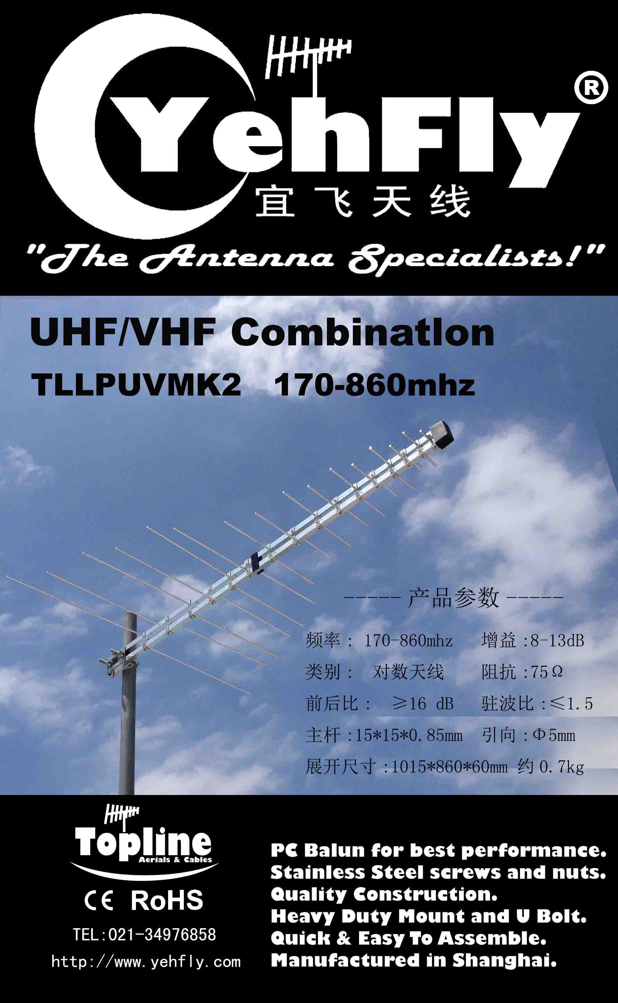 本厂生产各种中高挡天线与各种天线支架,产品出口澳州市场(澳州品牌:TOPLINE/中国品牌:宜飞YEHFLY) ,定向无源天线。产品认证:CE& ROHS