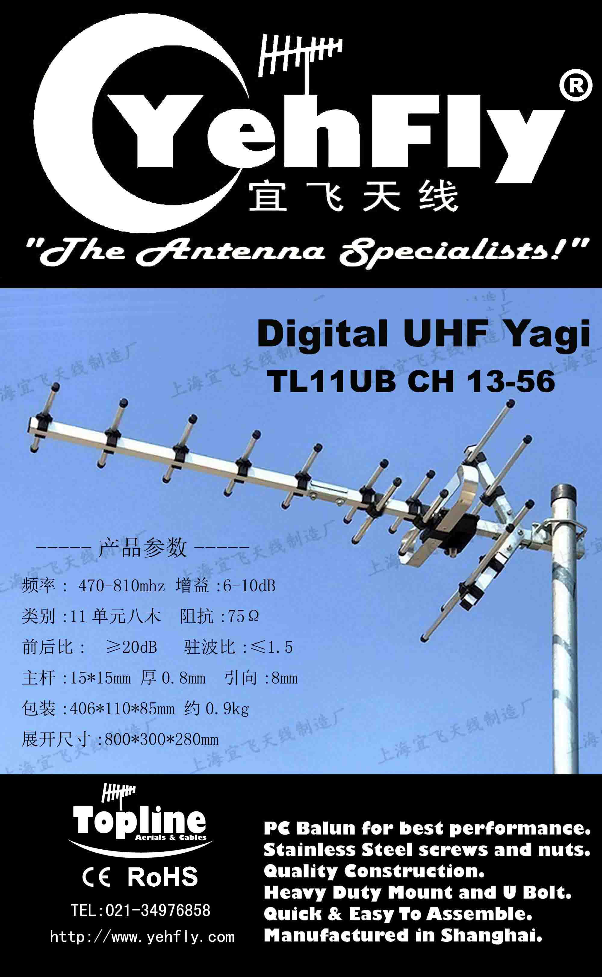 本厂生产各种UHF、VHF、UHV/VHF,中高挡天线与各种天线支架,产品出口澳州市场(澳州品牌:TOPLINE. 中国品牌:宜飞/YEHFLY) ,定向无源天线。产品认证:CE& ROHS