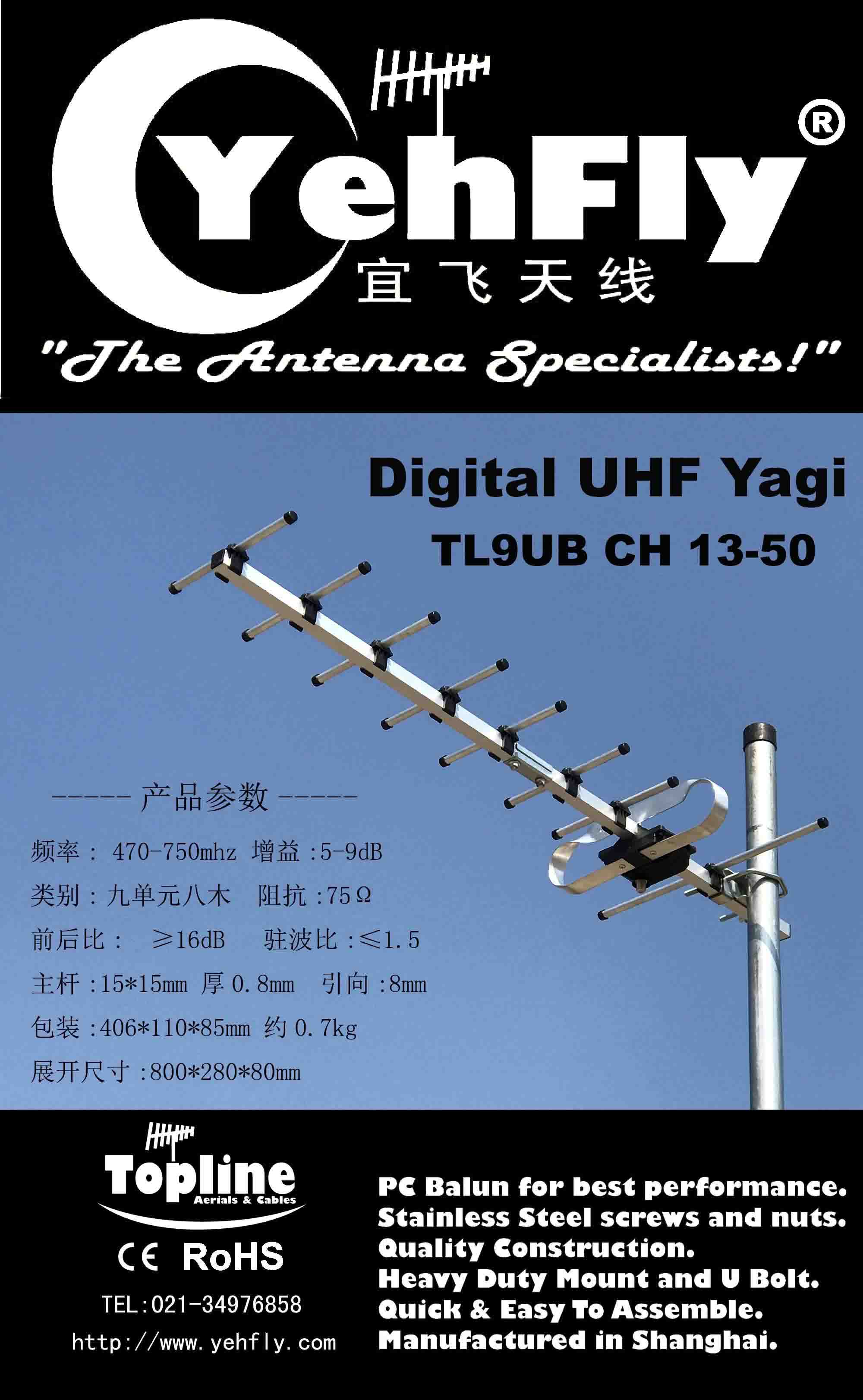 本厂生产各种UHF、VHF、UHV/VHF,中高挡天线与各种天线支架,产品出口澳州市场(澳州品牌:TOPLINE .中国品牌:宜飞/YEHFLY) ,定向无源天线。产品认证:CE& ROHS