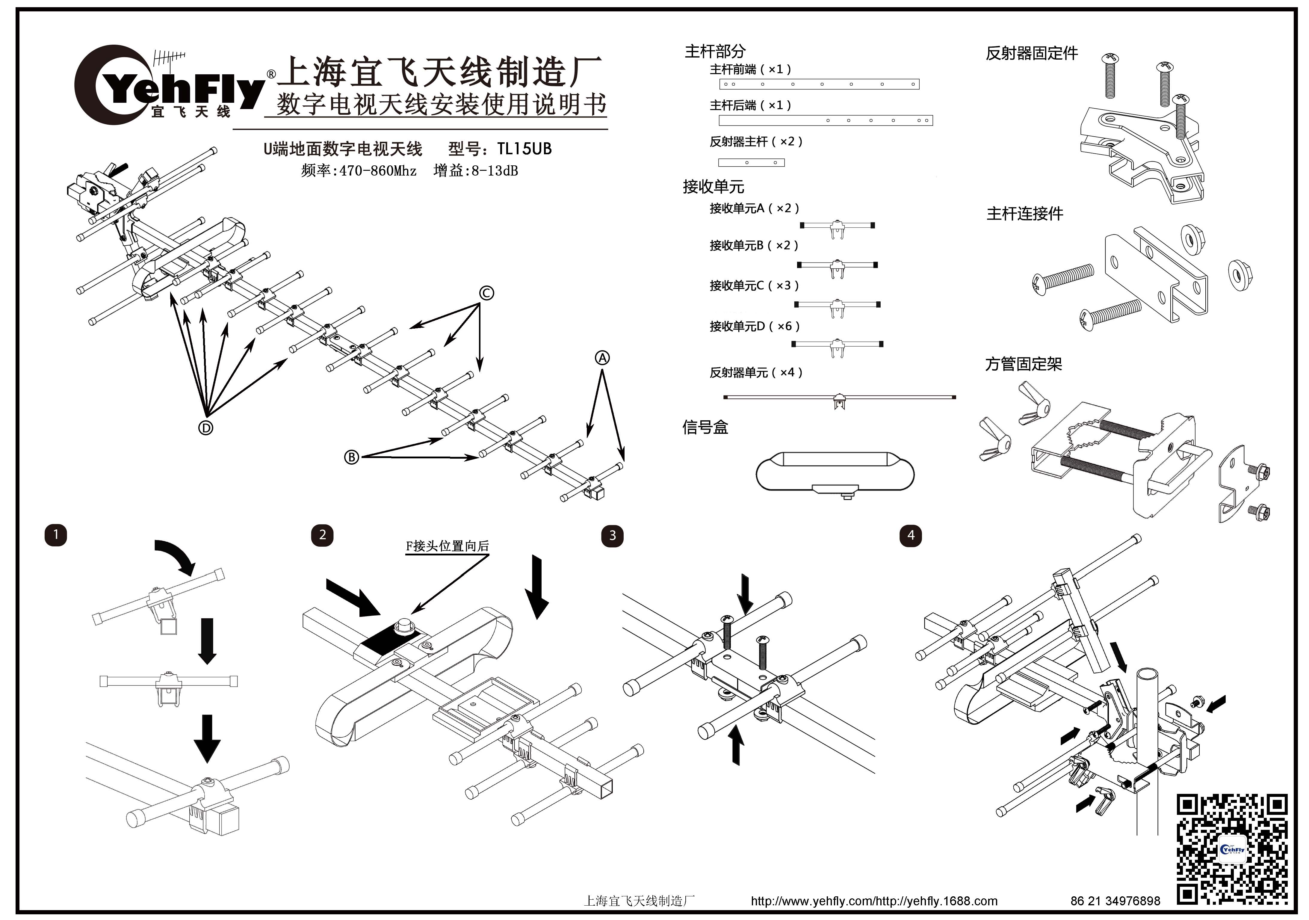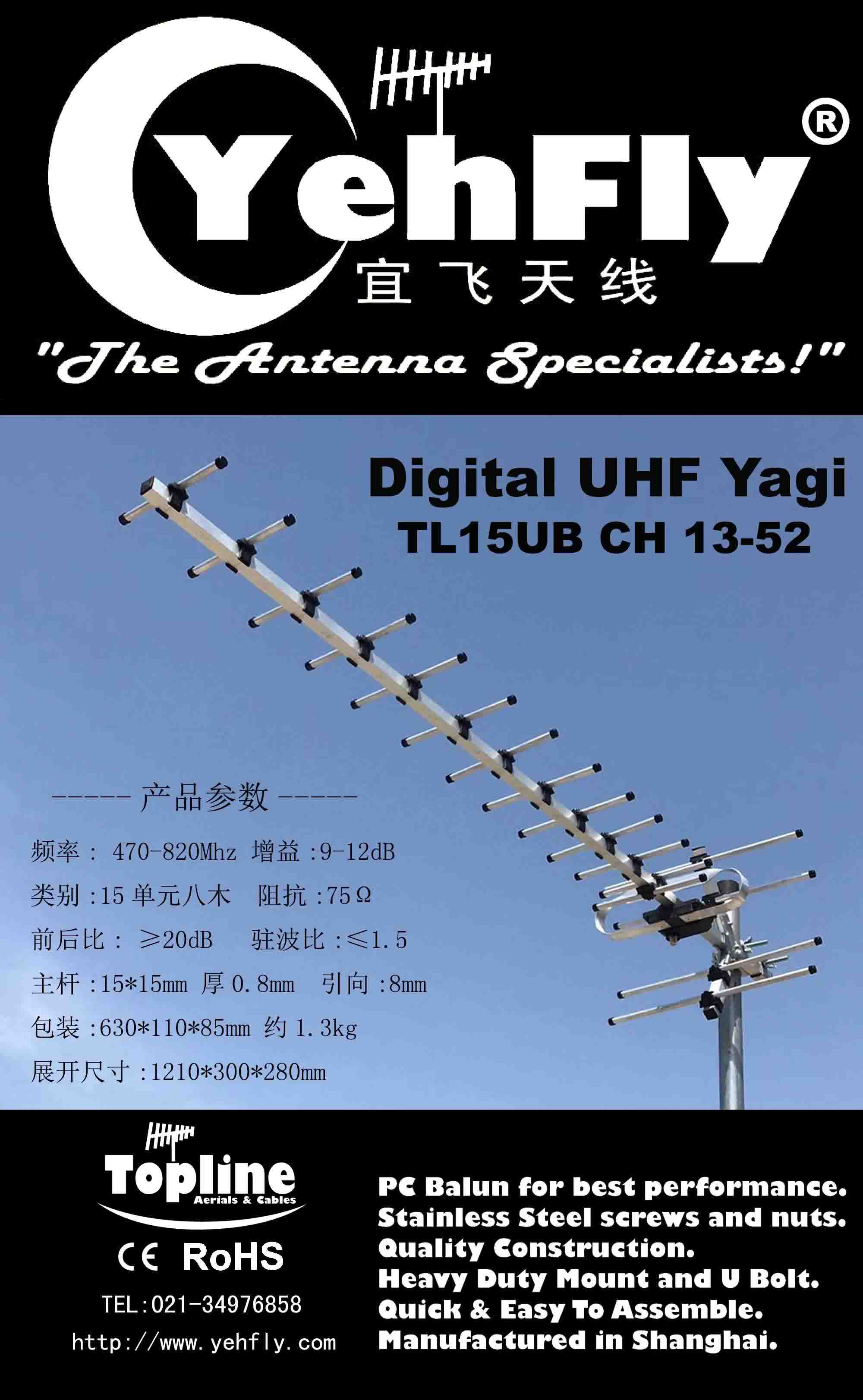 本厂生产各种UHF、VHF、UHV/VHF,中高挡天线与各种天线支架,产品出口澳州市场(澳州品牌:TOPLINE/中国品牌:宜飞/YEHFLY) ,定向无源天线。产品认证:CE& ROHS