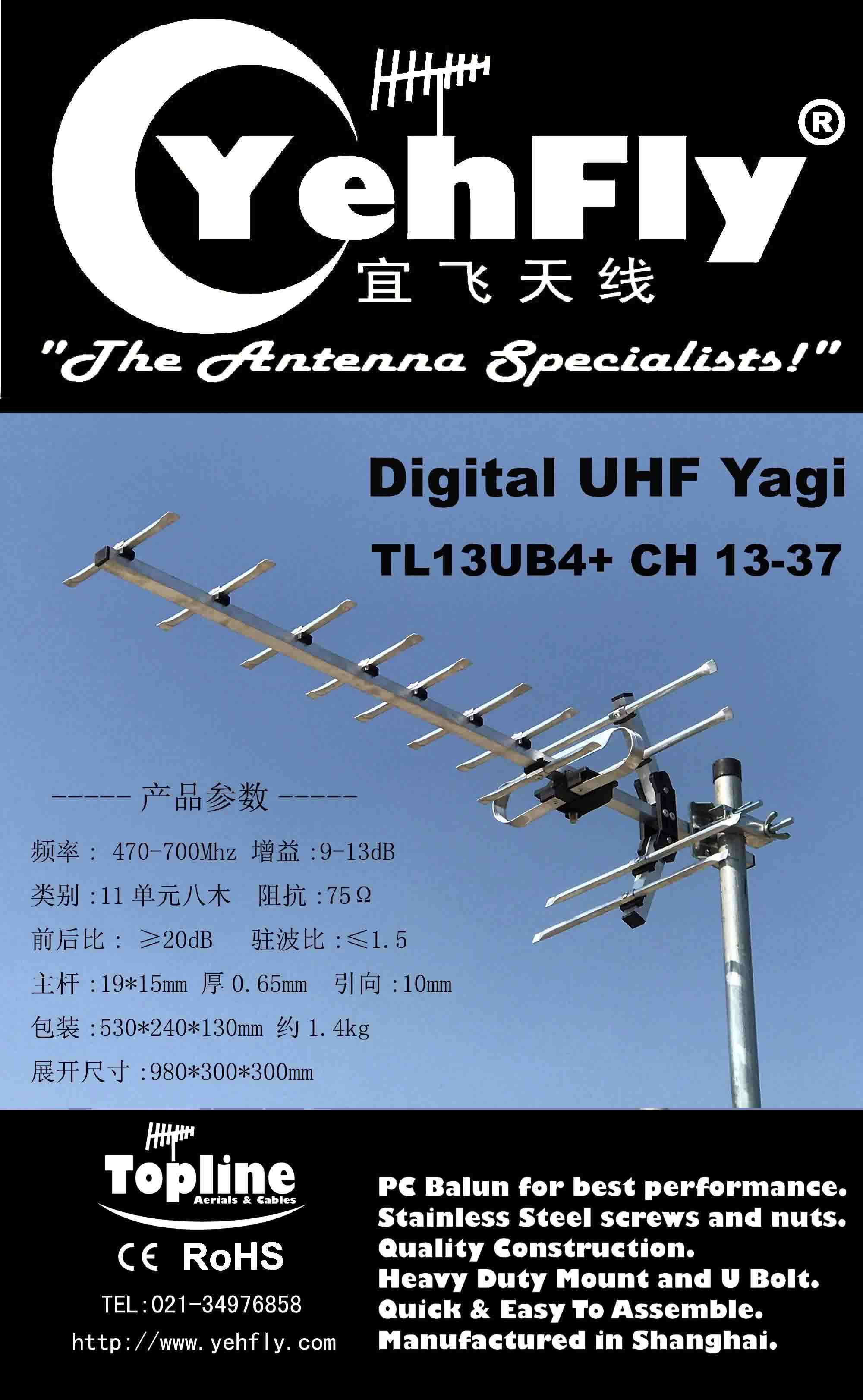 本厂生产各种中高挡天线与各种天线支架,产品出口澳州市场(澳州品牌:TOPLINE/中国品牌:宜飞/YEHFLY) ,定向无源天线。产品认证:CE& ROHS