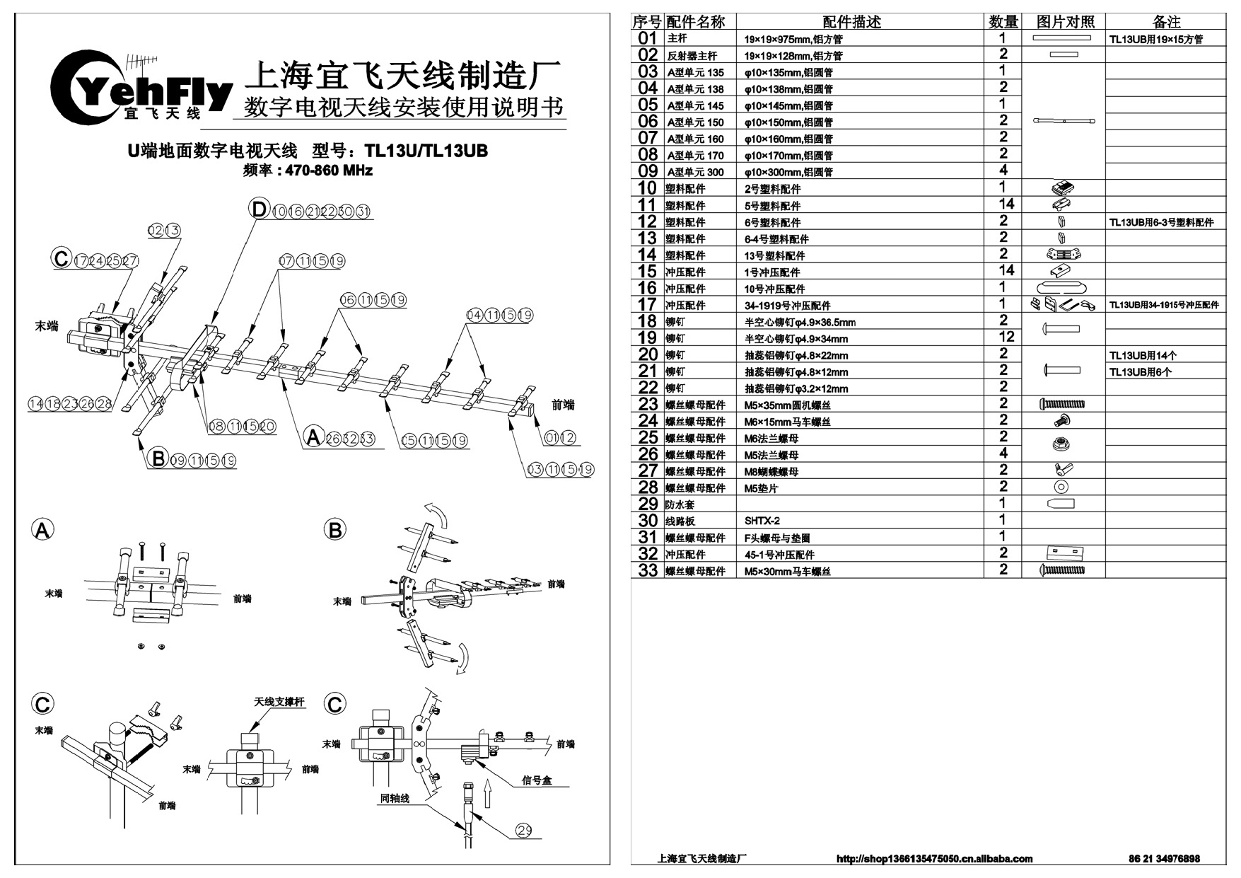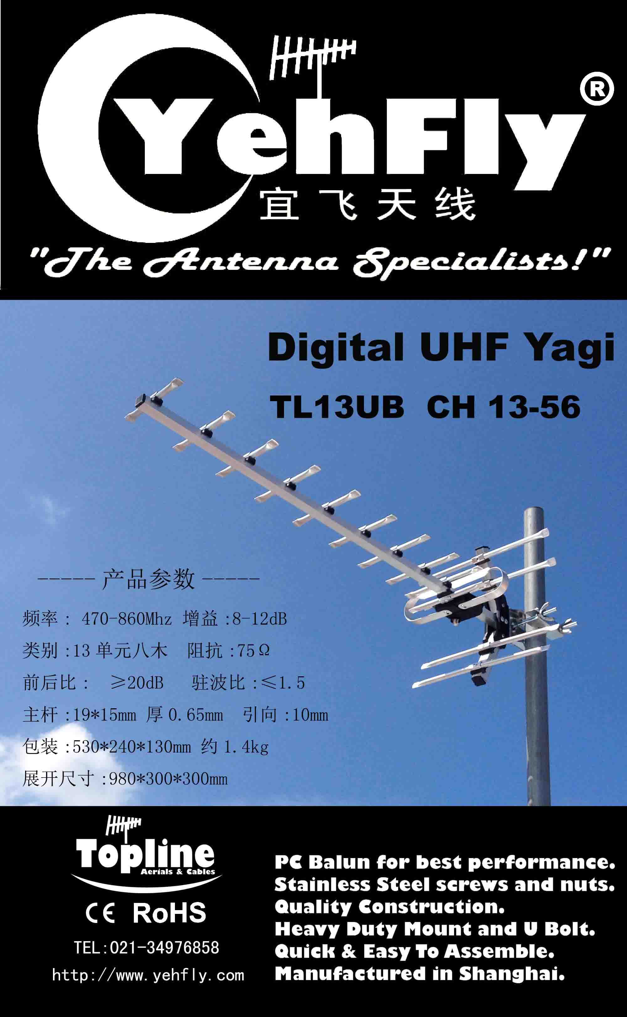 本厂生产各种UHF、VHF、UHV/VHF,中高挡天线与各种天线支架,产品出口澳州市场(澳州品牌:TOPLINE 中国品牌:宜飞/YEHFLY) ,定向无源天线。产品认证:CE& ROHS